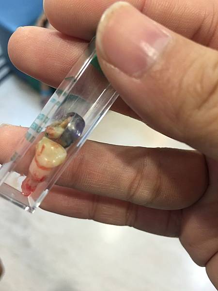 醫生給了門牙(好長哦)、還有拔除的 第一小臼齒乳牙 (好血腥)